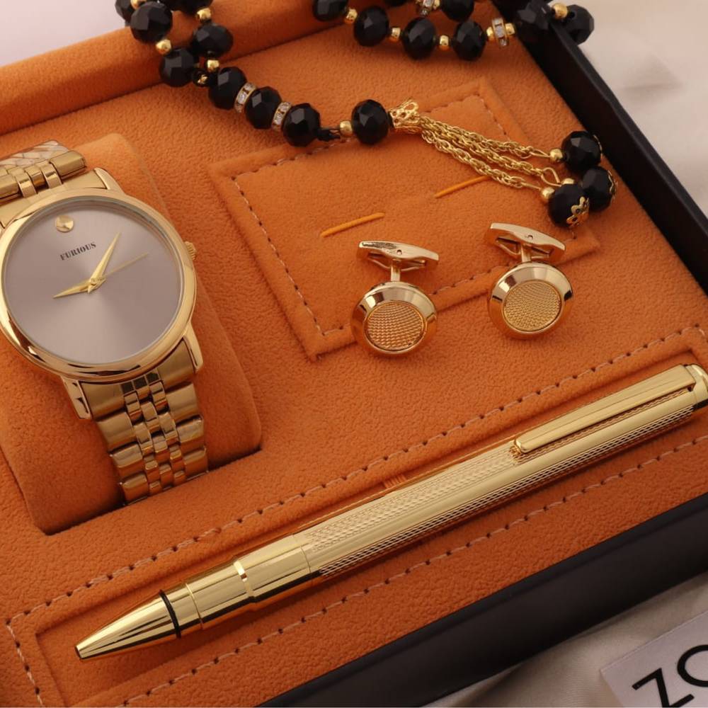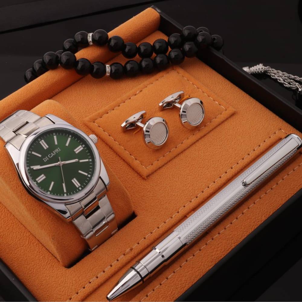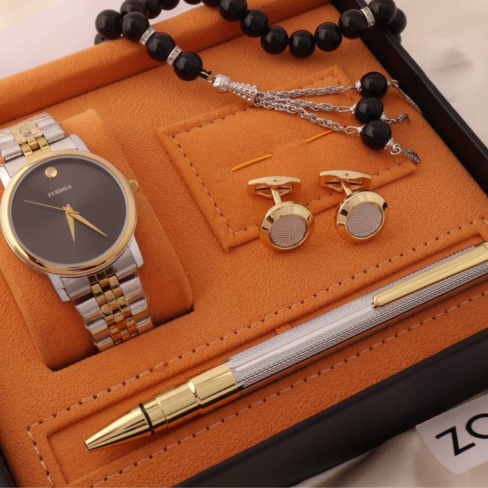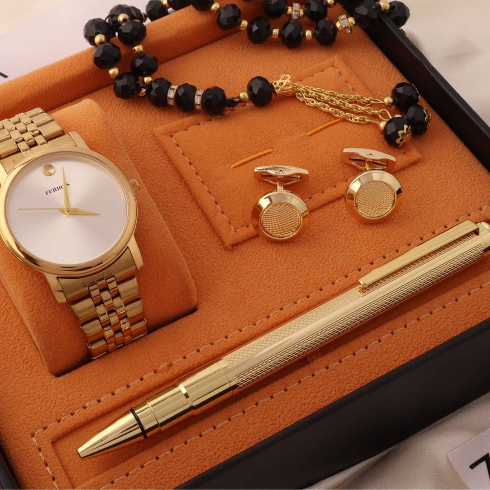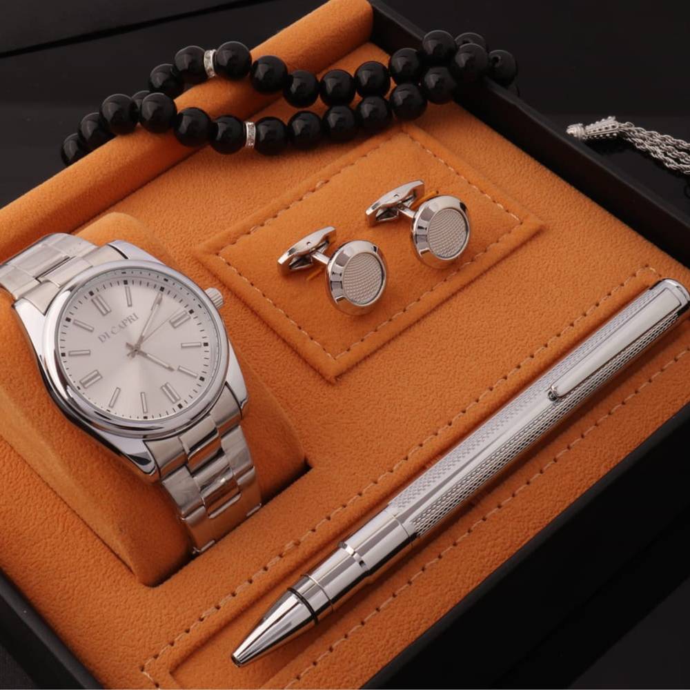 طقم مكون من ساعة وقلم وسبحه وكبك في علبة فخمة