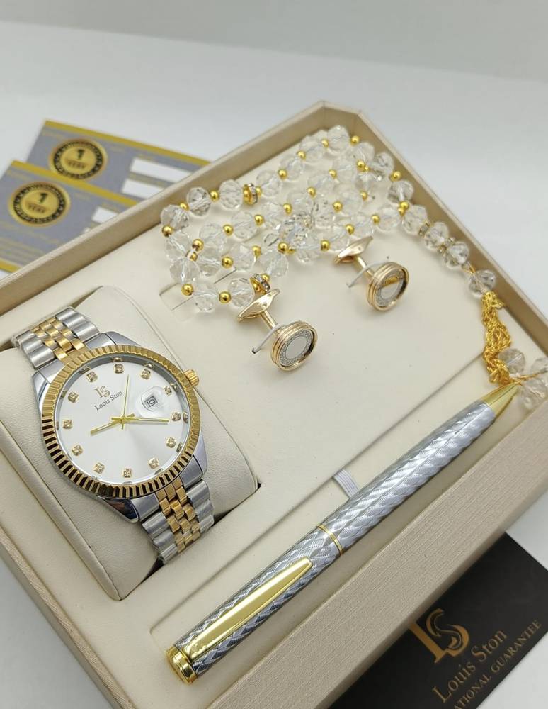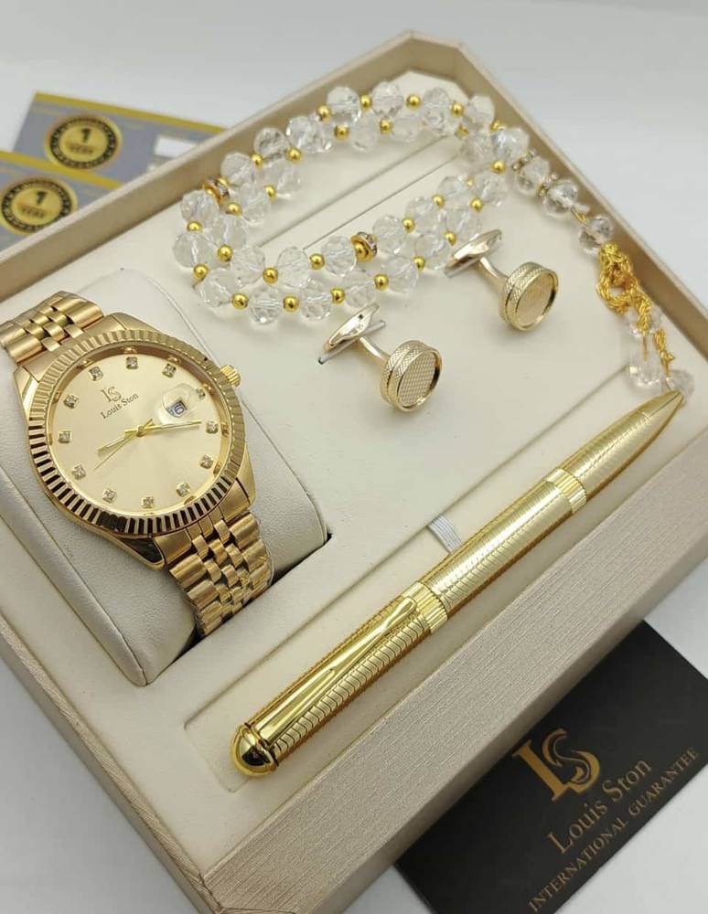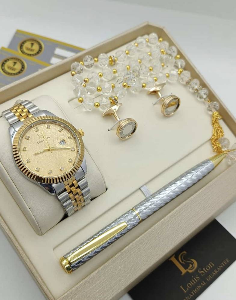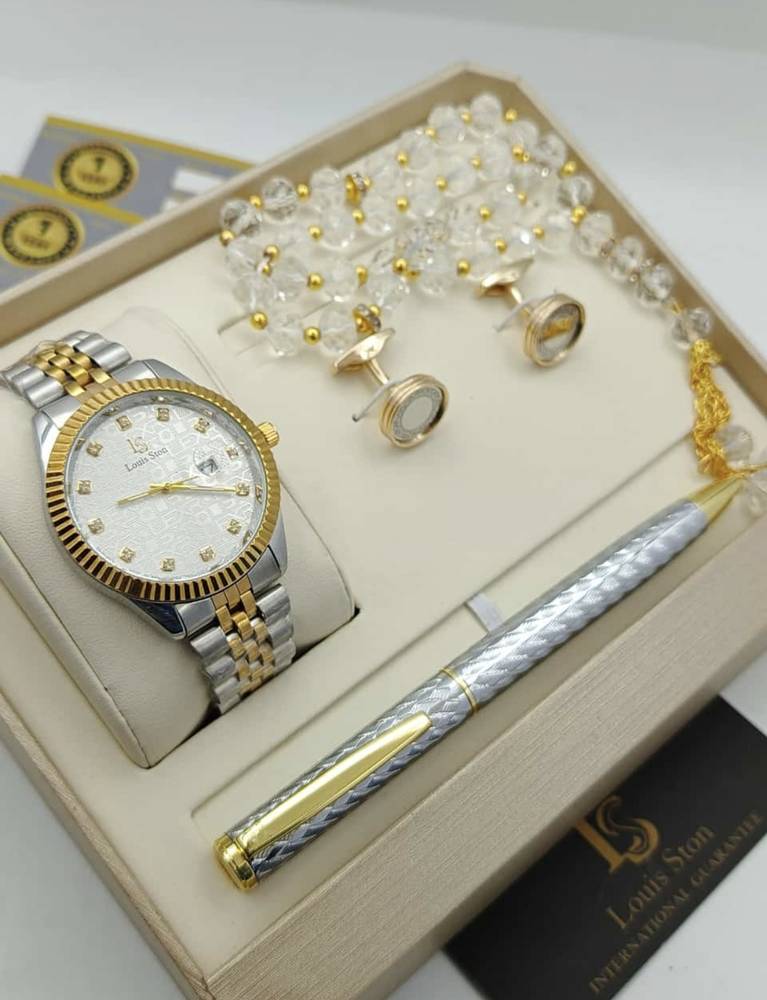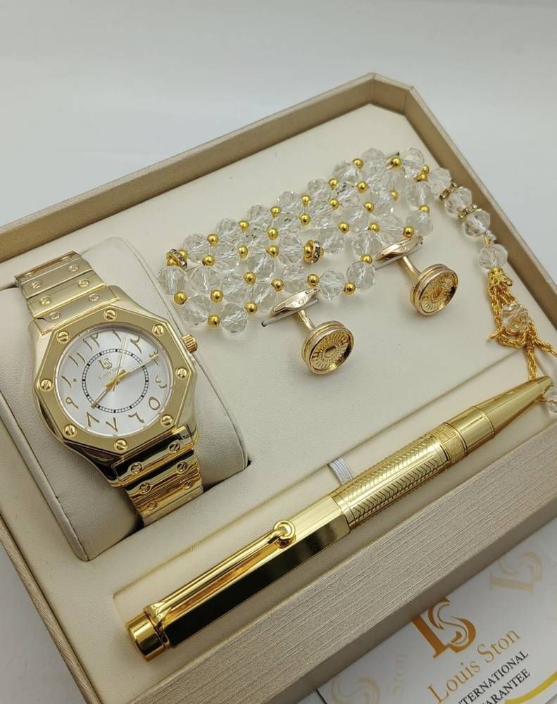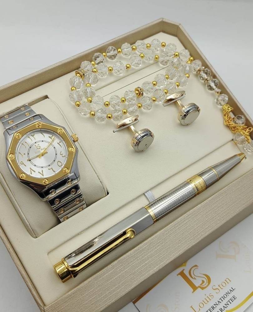 طقم يتكون من ساعة فاخرة ضد الماء مع سبحه وكبك وقلم في علبة فخمة