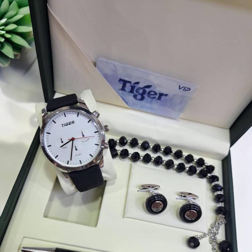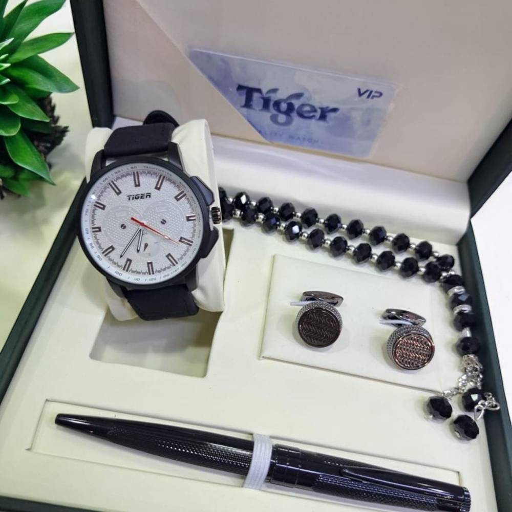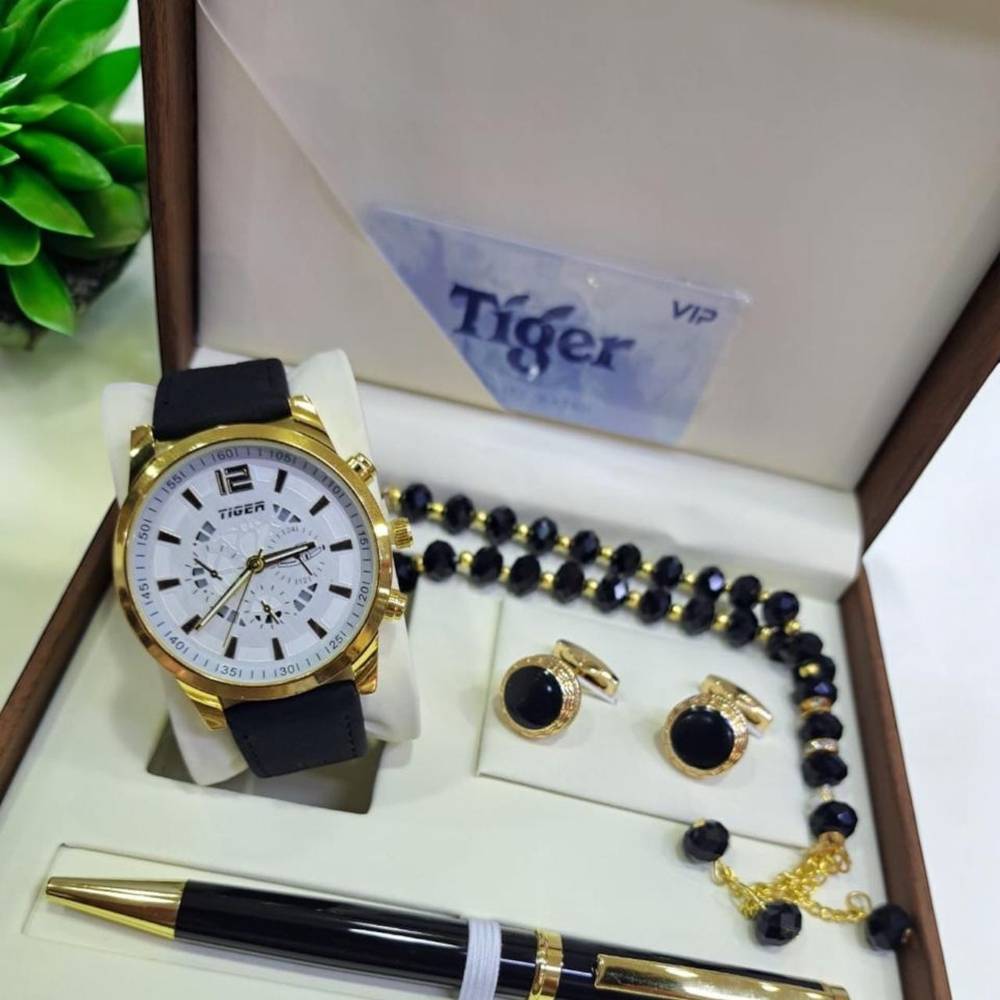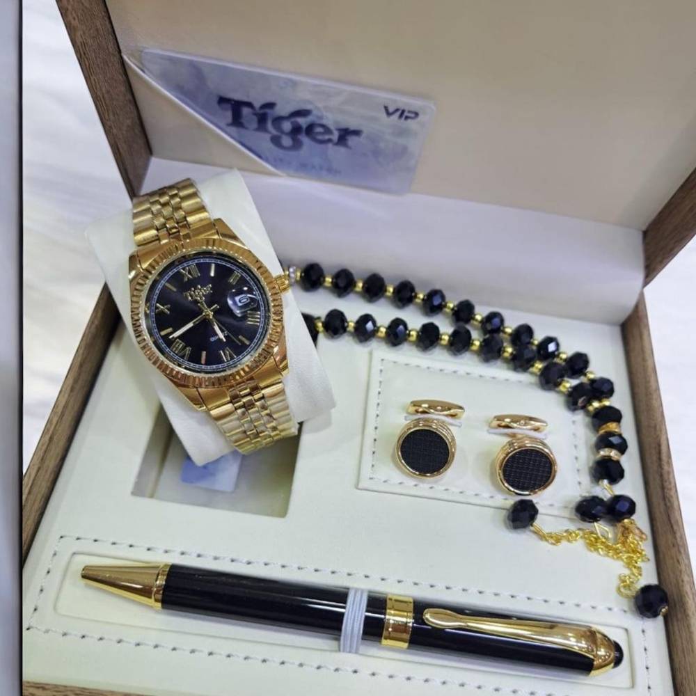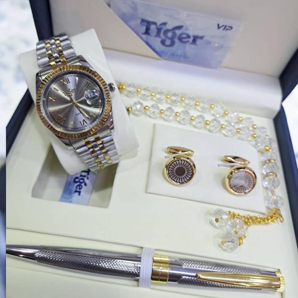 طقم مكون من ساعة فخمة ضد الماء و سبحه وقلم وكبك في علبة فخمة